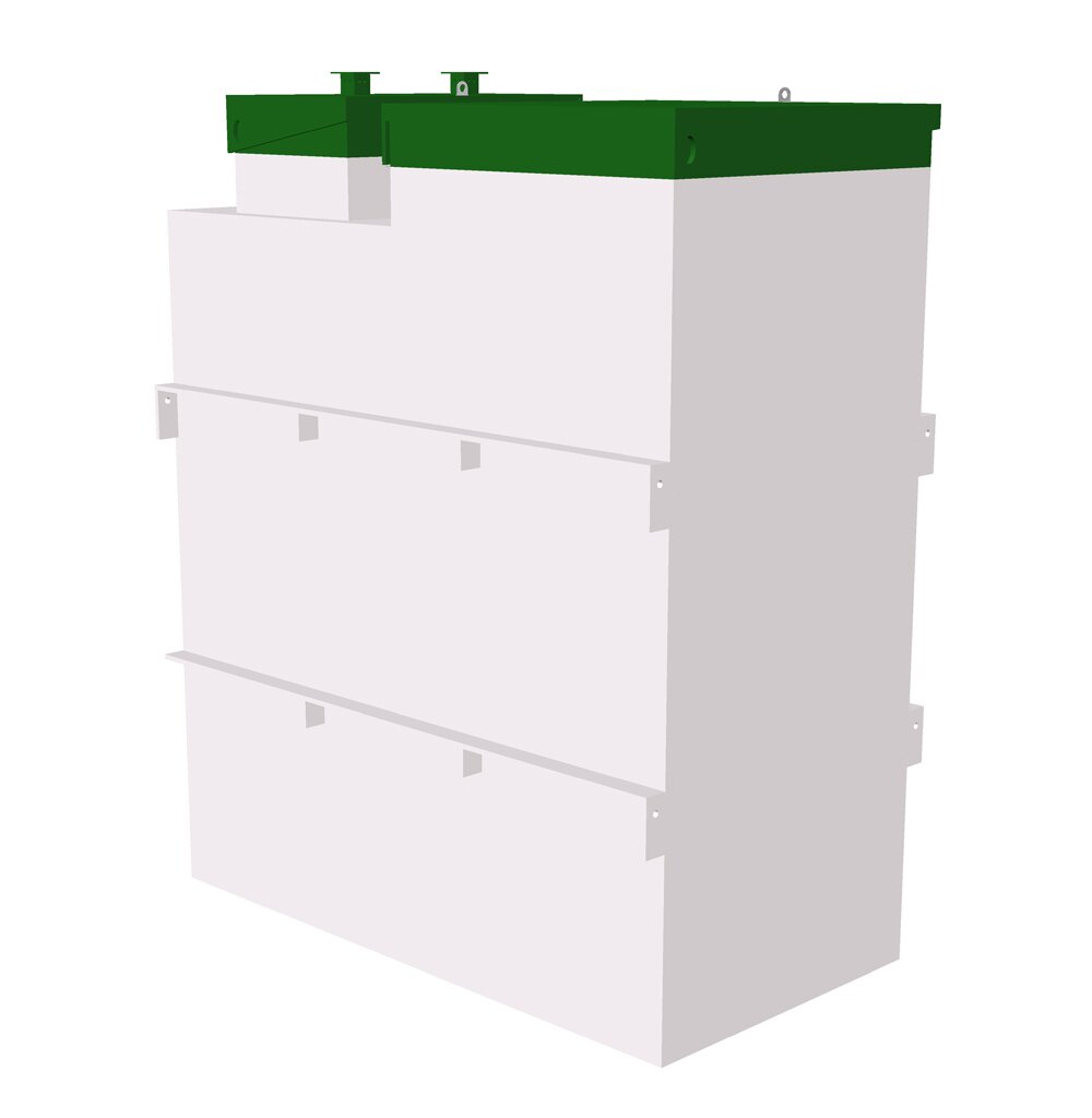 Установка для очистки канализационного стока с параметром очищенной воды на выходе достигающем 99%. Устанавливается на дом где суточный расход воды не превышает 3-х метров кубических. Закапывается в землю на глубину 2,3 метра при этом оставляя на поверхности две крышки, одна из которых служит для проверки и обслуживания электрической части, а через другую осуществляется доступ ко всем элементам очистного сооружения. Обслуживание данной аэрационной станции производится с периодичностью 3-4 раза в год в зависимости от интенсивности загрузки, которая в пиковые дни может достигать до 15 человек. Максимальный пиковый сброс в септик рассчитан на 860 литров.